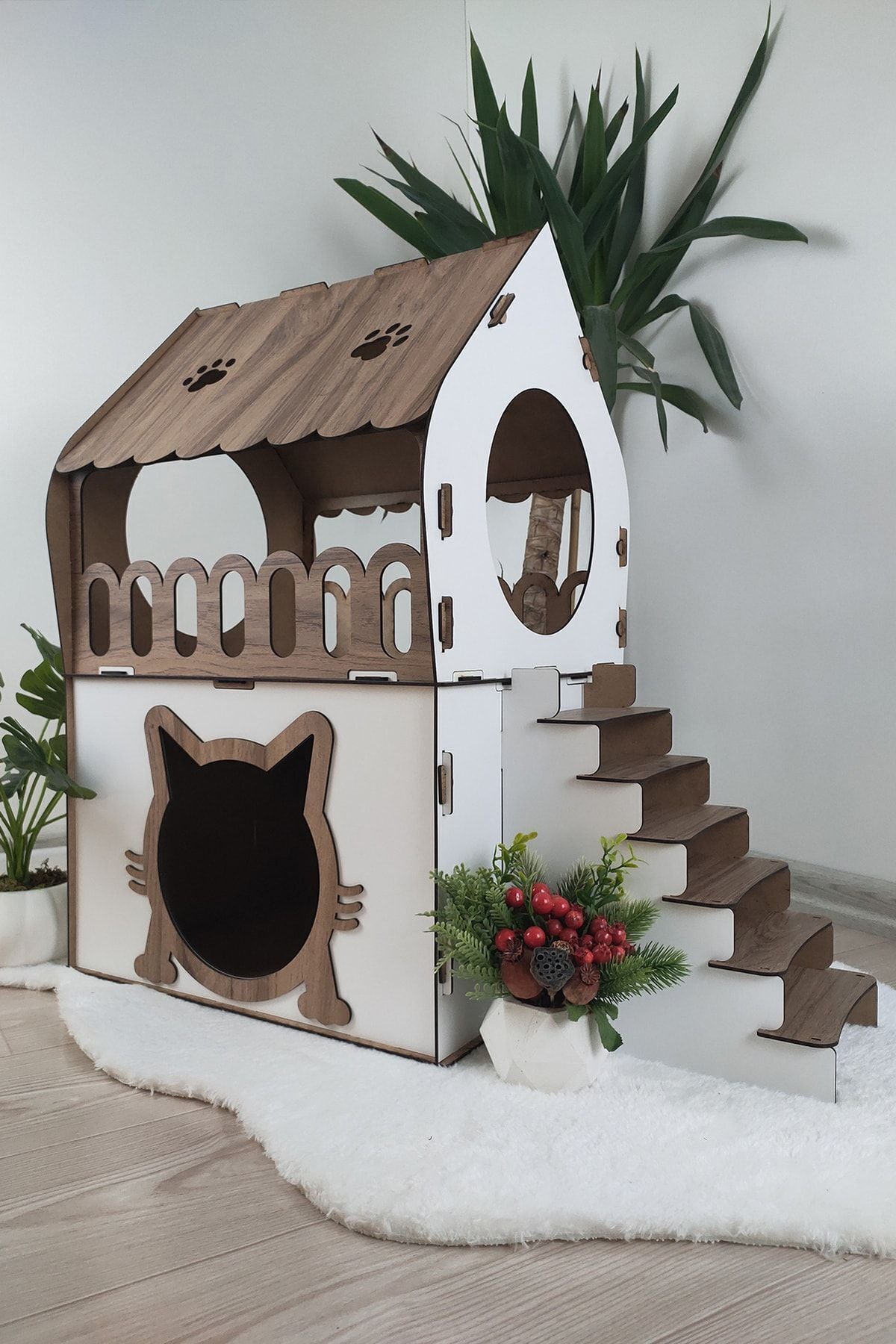 Dekoratif kedi evi *Kedilerinizi daha konforlu yaşamaları için tasarlanmıştır.; *1 veya 2 adet kediniz varsa bu ev tam onlara göre onlara daha fazla oyun alanı sağlar.; *Isterseniz kedinizin ismini yazdırabilirsiniz.; (sipariş verdikten sonra sipariş numaranızile birlikte kedinizin ismini bize yazmanız yeterlidir.; Sipariş numarası ile bildirilmeyen siparişler isimliksiz olarak gönderilecektir.; ) *Aksesuarlar (minderler, keçeler ve fotograf çekimi için kullanılan objeler) fiyata dahil değildir.; *3mm mdf kullanılarak üretilmiştir.; *Demonte olarak gönderilmektedir.; Kurulumu kolaydır.; Kurulum montaj kılavuzu yanında gönderilmektedir.; *Yapıstırıcı, vida vs.; Gerektırmez.; *Herhangi bir sorunuz varsa lütfen bizimle iletişime geçiniz.