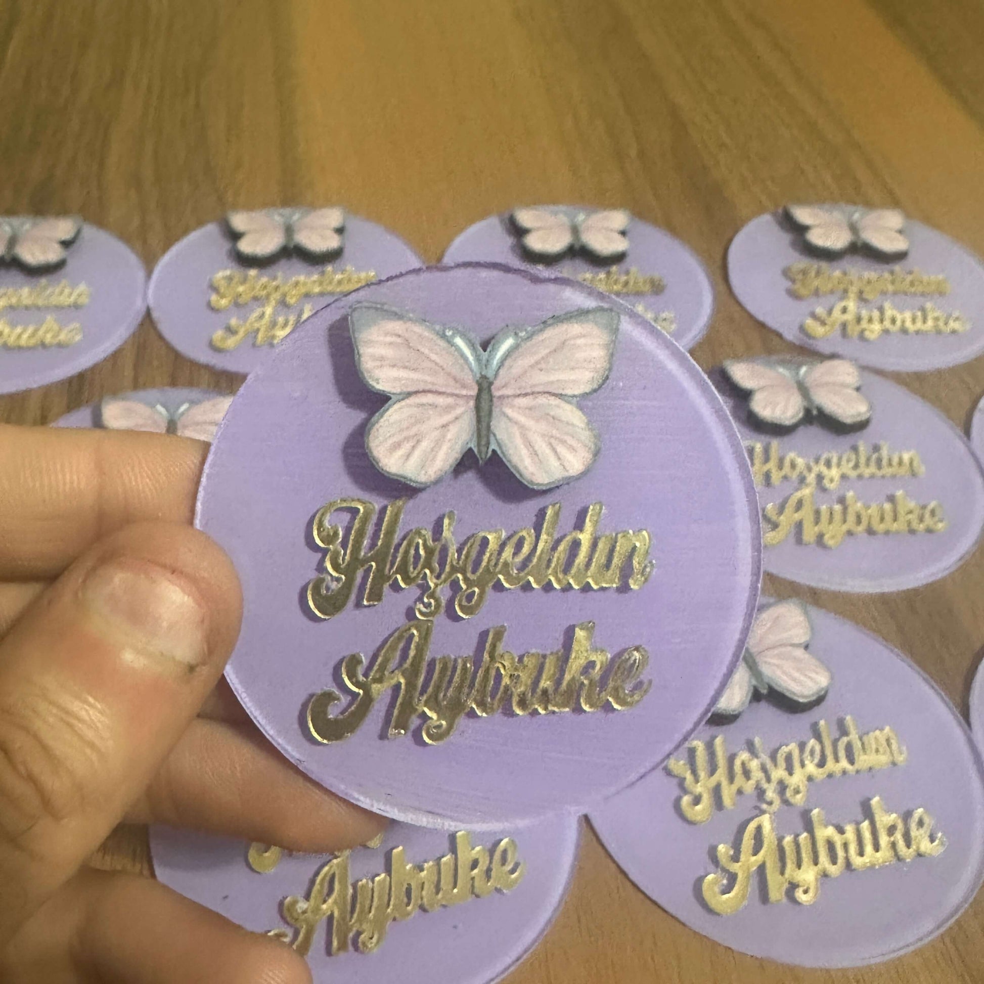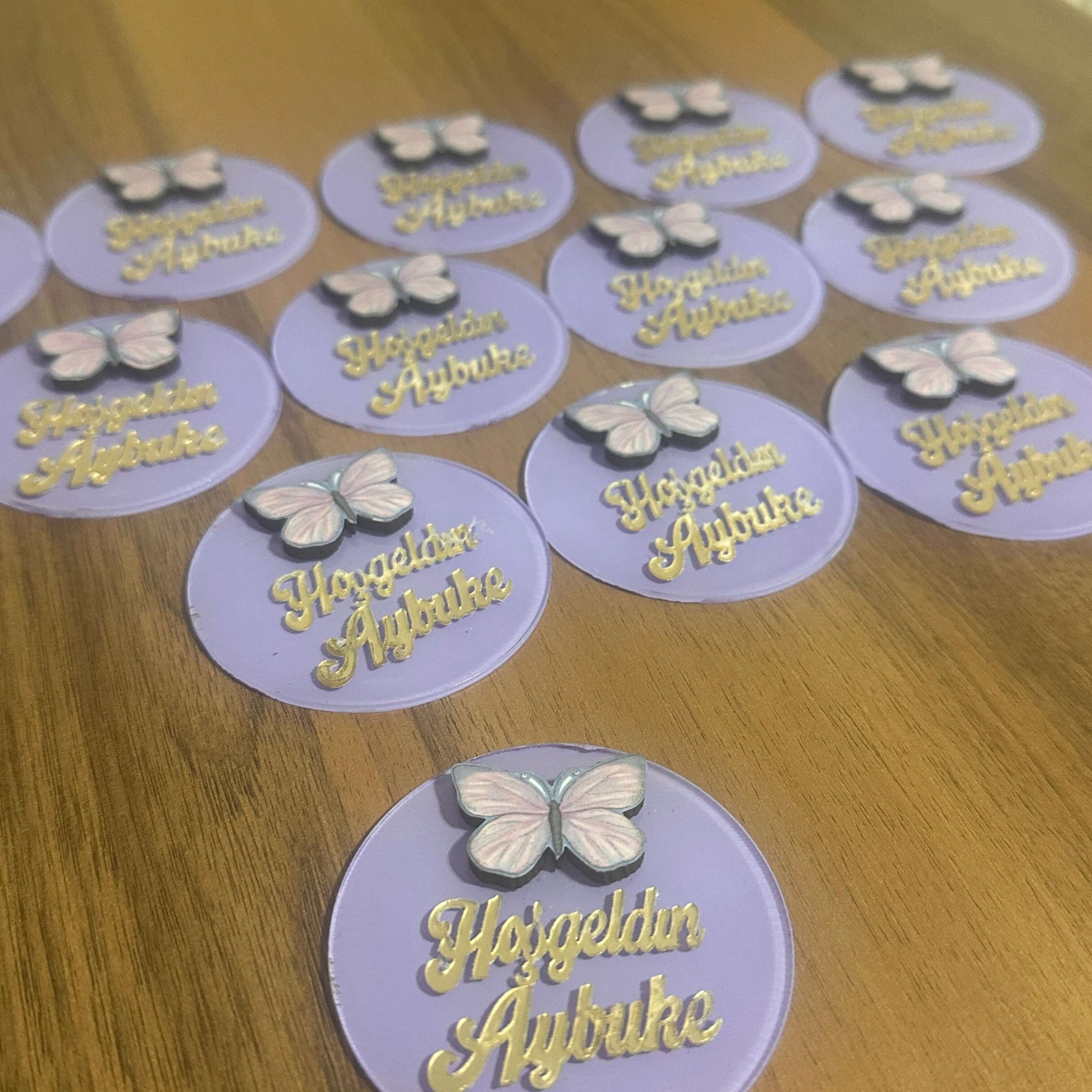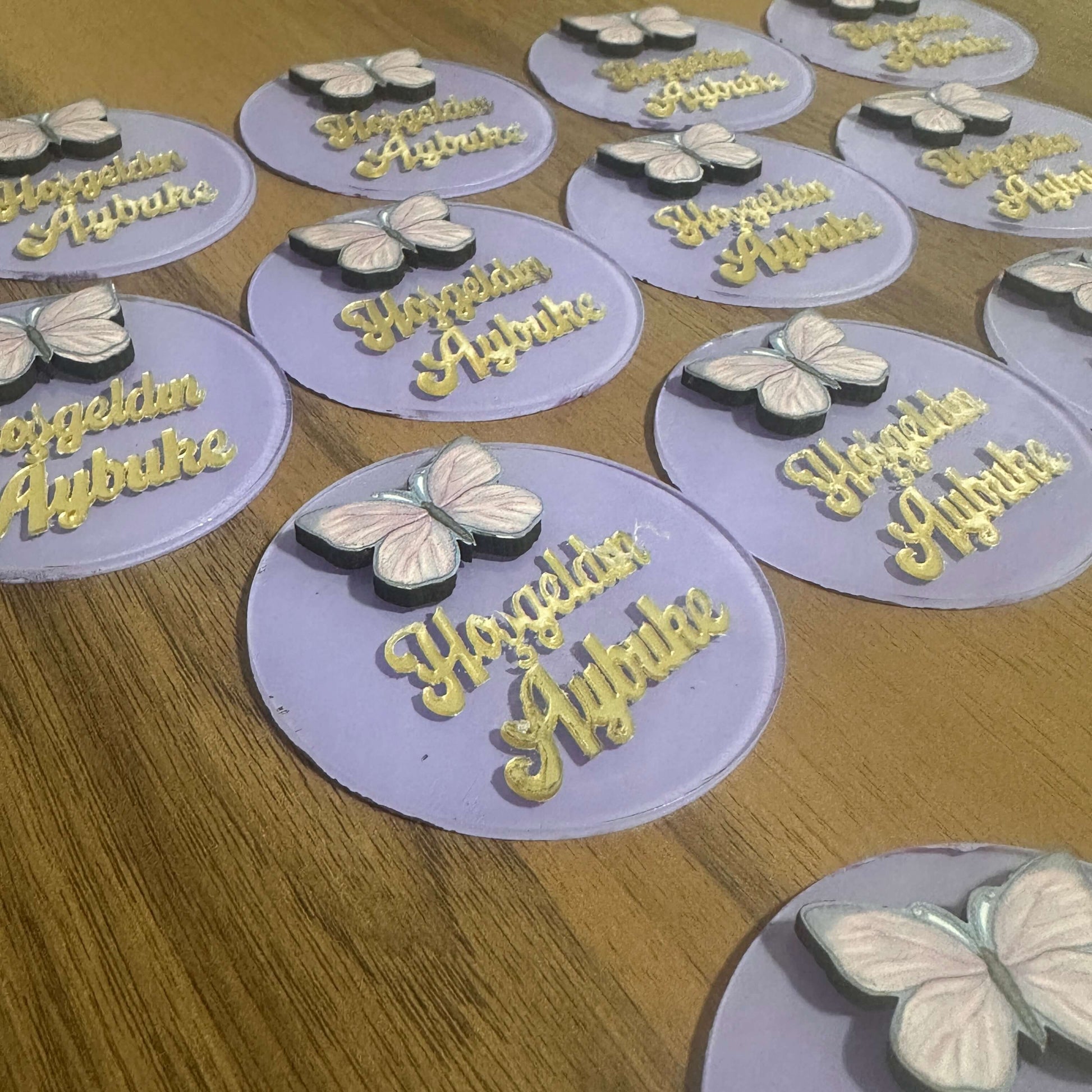 Kişiye Özel Kelebek Figürlü Şeffaf Pleksi Magnet – Aynalı Yazı Tasarımlı Bebek Doğum Günü & Hoş Geldin Hediyeliği 10 Adet