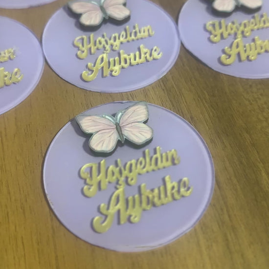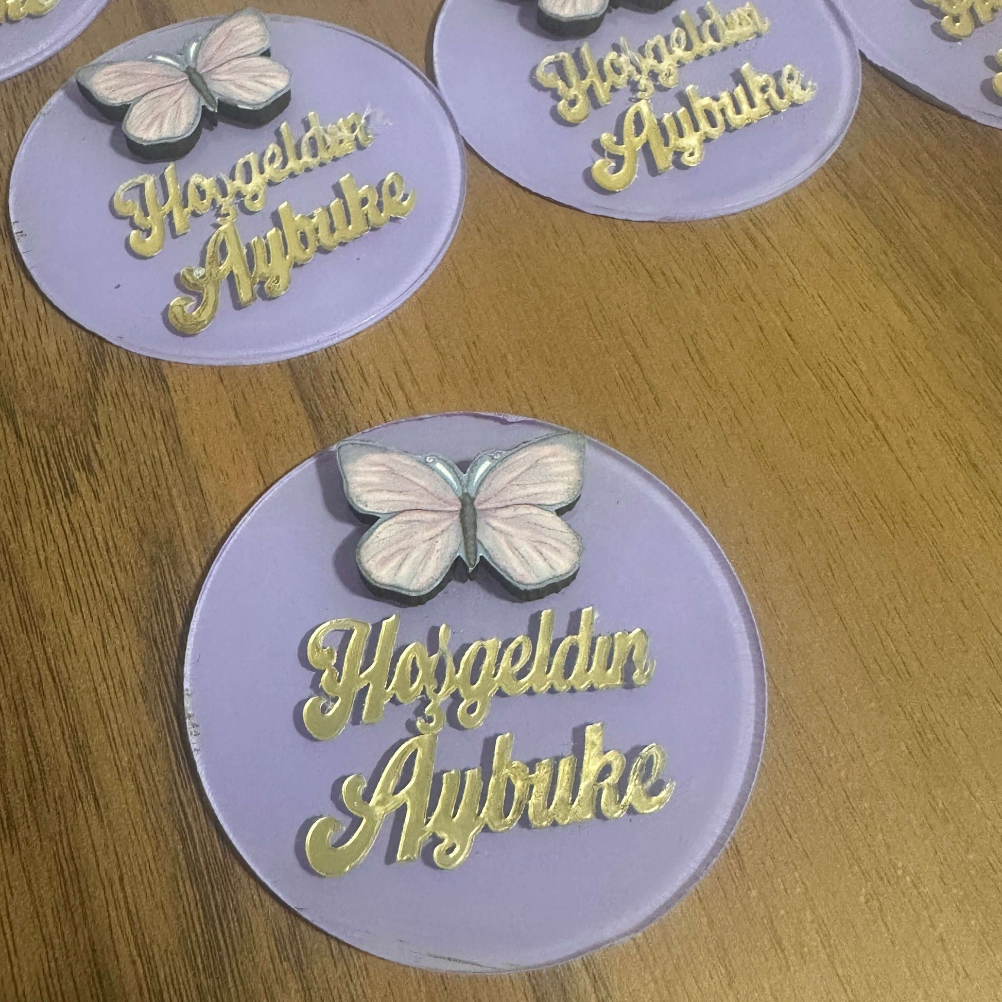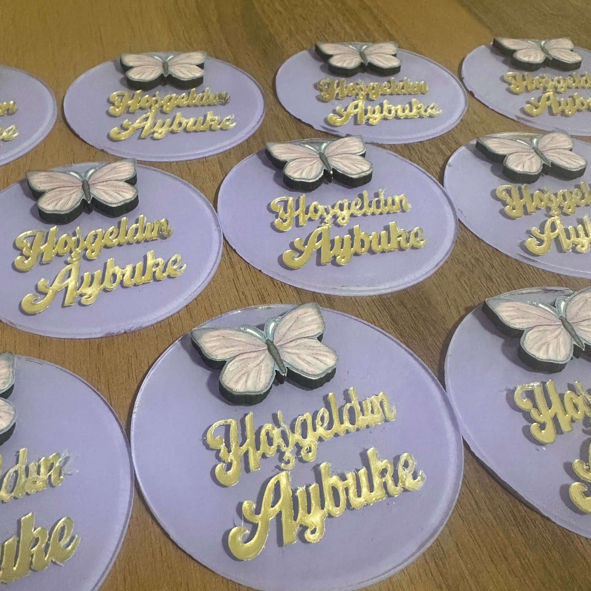 Kişiye Özel Kelebek Figürlü Şeffaf Pleksi Magnet – Aynalı Yazı Tasarımlı Bebek Doğum Günü & Hoş Geldin Hediyeliği 10 Adet